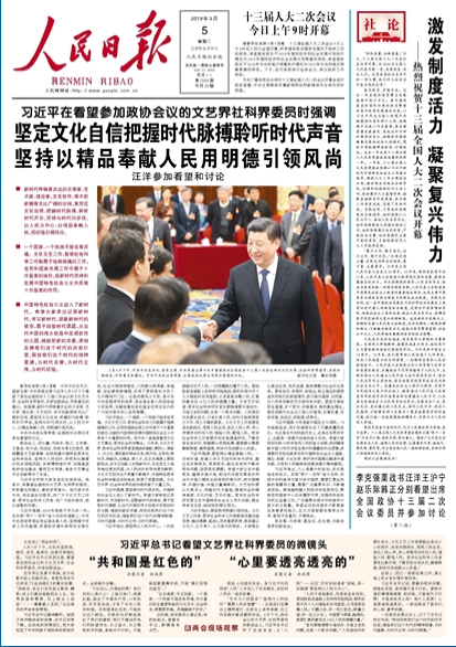 新華社北京3月4日電 中共中央總書記、國(guó)家主席、中央軍委主席習(xí)近平3月4日下午看望了參加全國(guó)政協(xié)十三屆二次會(huì)議的文化藝術(shù)界、社會(huì)科學(xué)界委員,并參加聯(lián)組會(huì),聽取意見和建議。他強(qiáng)調(diào),新時(shí)代呼喚著杰出的文學(xué)家、藝術(shù)家、理論家,文藝創(chuàng)作、學(xué)術(shù)創(chuàng)新?lián)碛袩o比廣闊的空間,要堅(jiān)定文化自信、把握時(shí)代脈搏、聆聽時(shí)代聲音,堅(jiān)持與時(shí)代同步伐、以人民為中心、以精品奉獻(xiàn)人民、用明德引領(lǐng)風(fēng)尚。