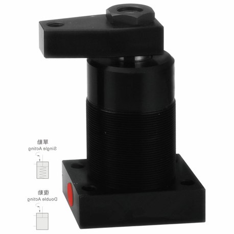 在機床上配合使用對工件快速裝夾、快速打開,適用于生產(chǎn)節(jié)奏快,對工件加工精度要求高的場合。 轉(zhuǎn)角缸工作過程,活塞先行完成旋轉(zhuǎn)行程--壓臂下壓并旋轉(zhuǎn)至設計的規(guī)定位置和角度,然后完成夾持行程--即直線下壓并夾緊工件。裝夾工件前壓臂離開工件。工件裝好后,通過換向伐控制壓臂旋轉(zhuǎn)到工件上方,再垂直向下直線運動將工件壓緊;釋放工件時,壓臂自動按壓緊的路線返回到原來的位置讓開工件,操作者就可以順利方便的卸下工件。