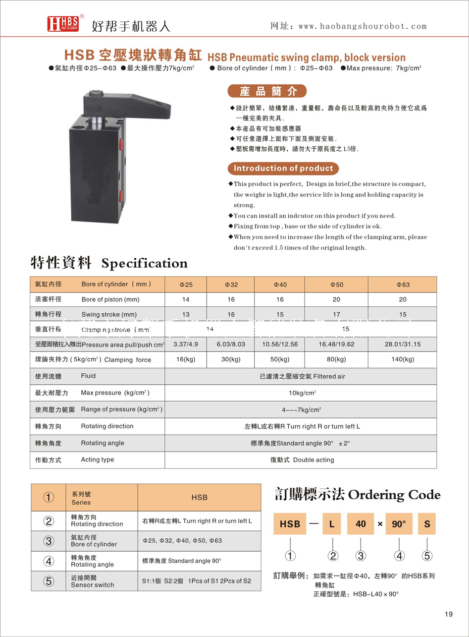 • HSB 空壓塊狀轉(zhuǎn)角缸 HSB Pneumatic Swing Clamp,Block Version,HPSB,PSB